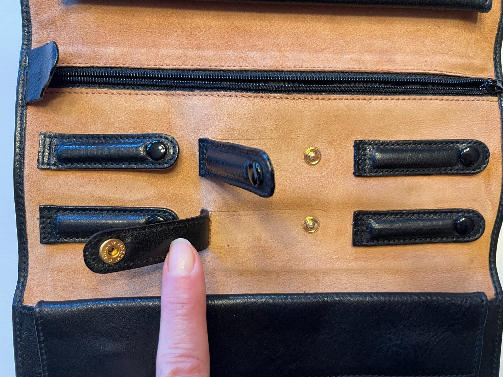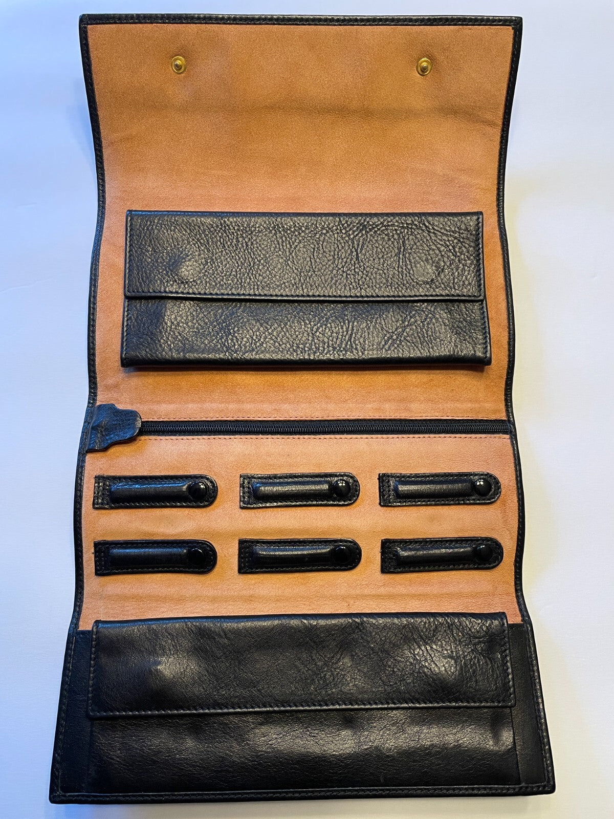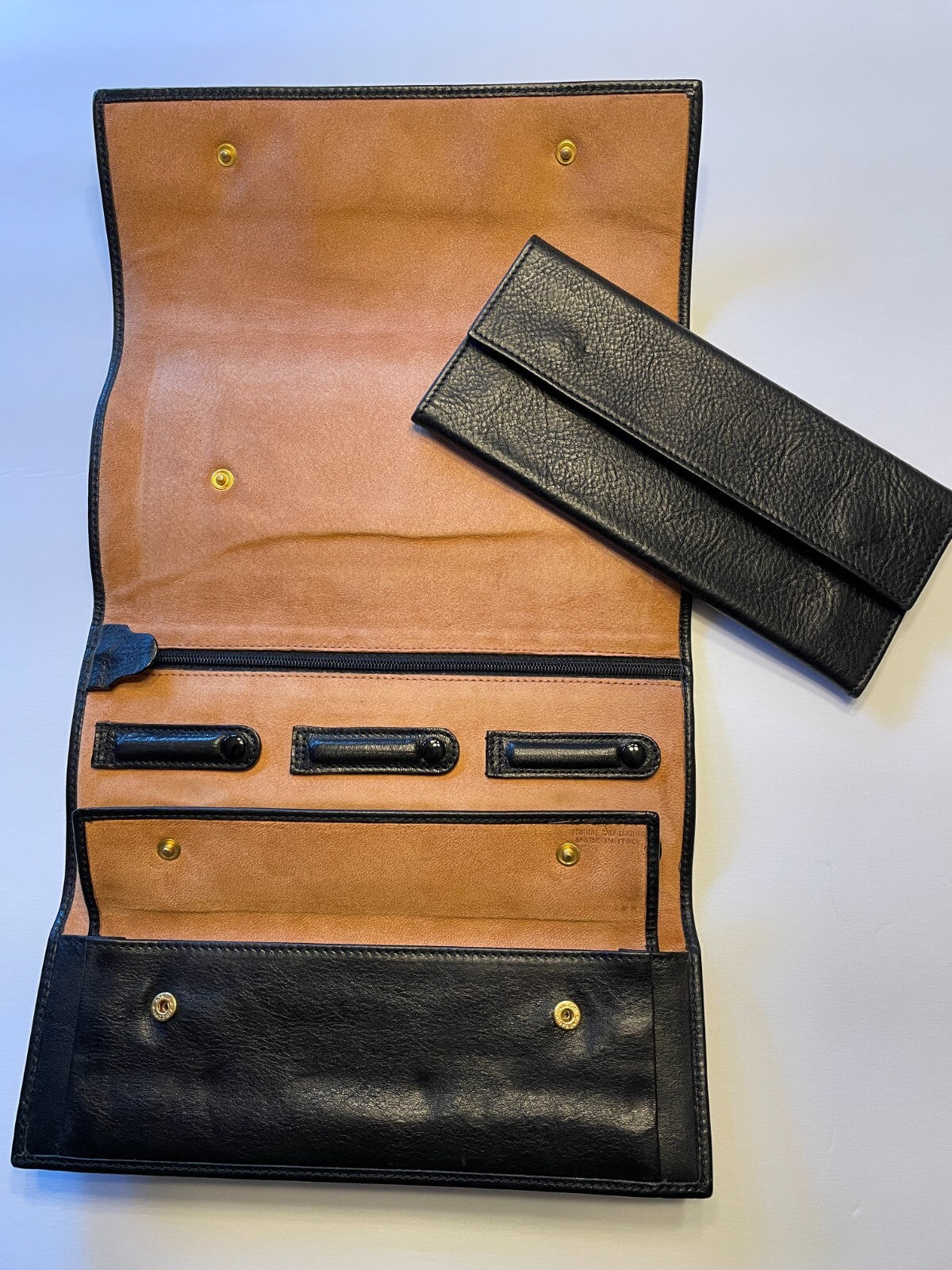 This elegant tri-fold design offers excellent organization while maintaining a sleek, sophisticated profile. The soft black calf leather exterior pairs beautifully with the warm tan leather interior, accented with polished gold-tone snap hardware.