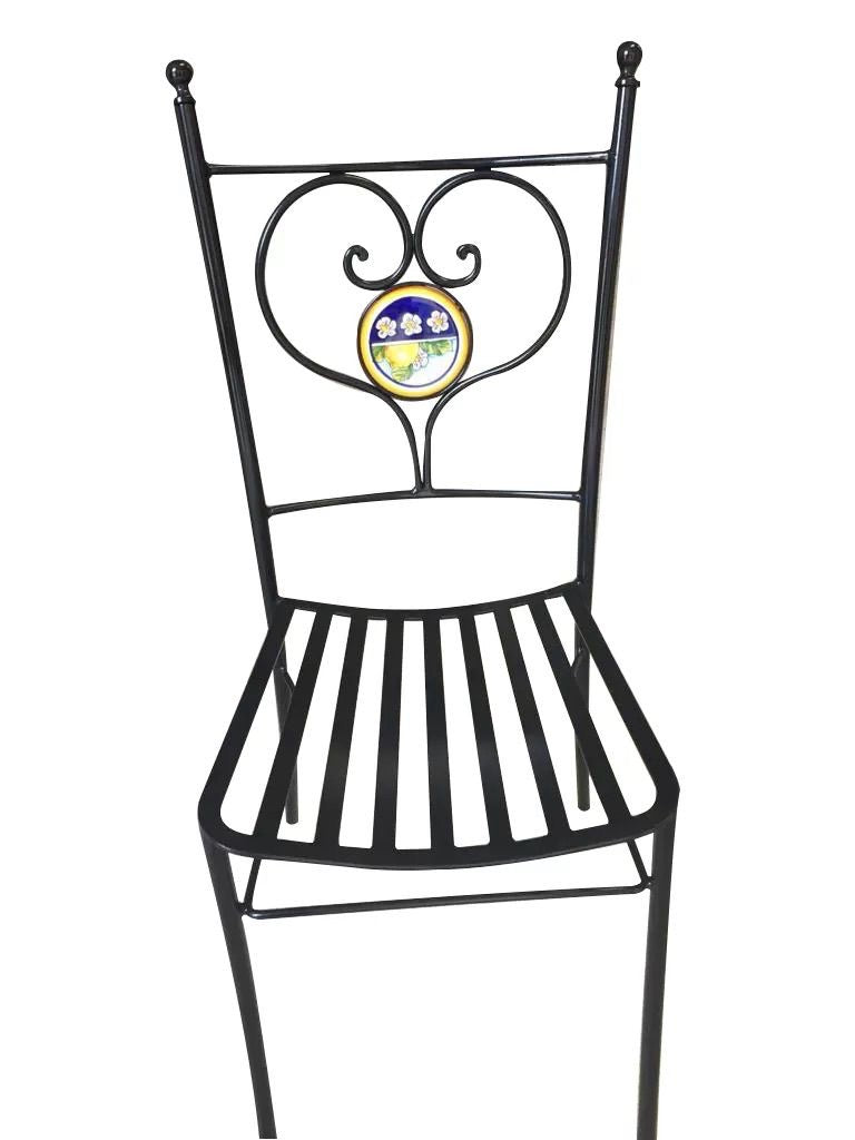 Made in Sorrento, Italy, these beautiful hand-made, hand-painted iron chairs with volcanic stone medallion can be used inside or outside as they withstand cold and rain.