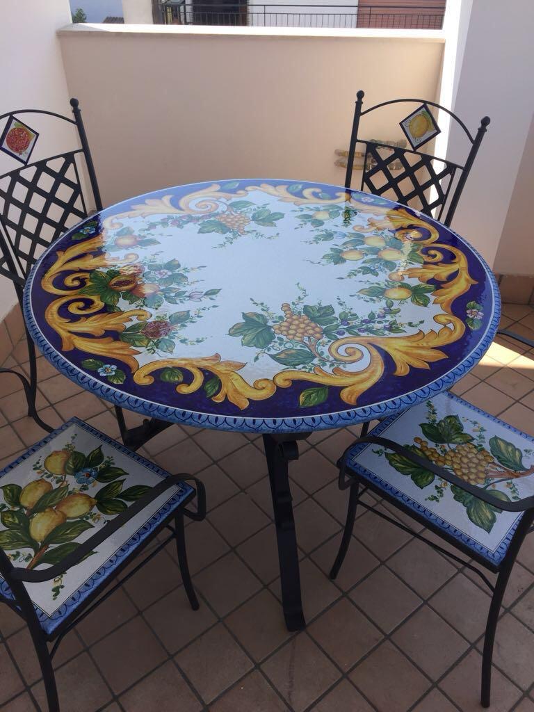 Made in Sorrento, Italy, these beautiful hand-made, hand-painted iron chairs with volcanic stone medallion can be used inside or outside as they withstand cold and rain.