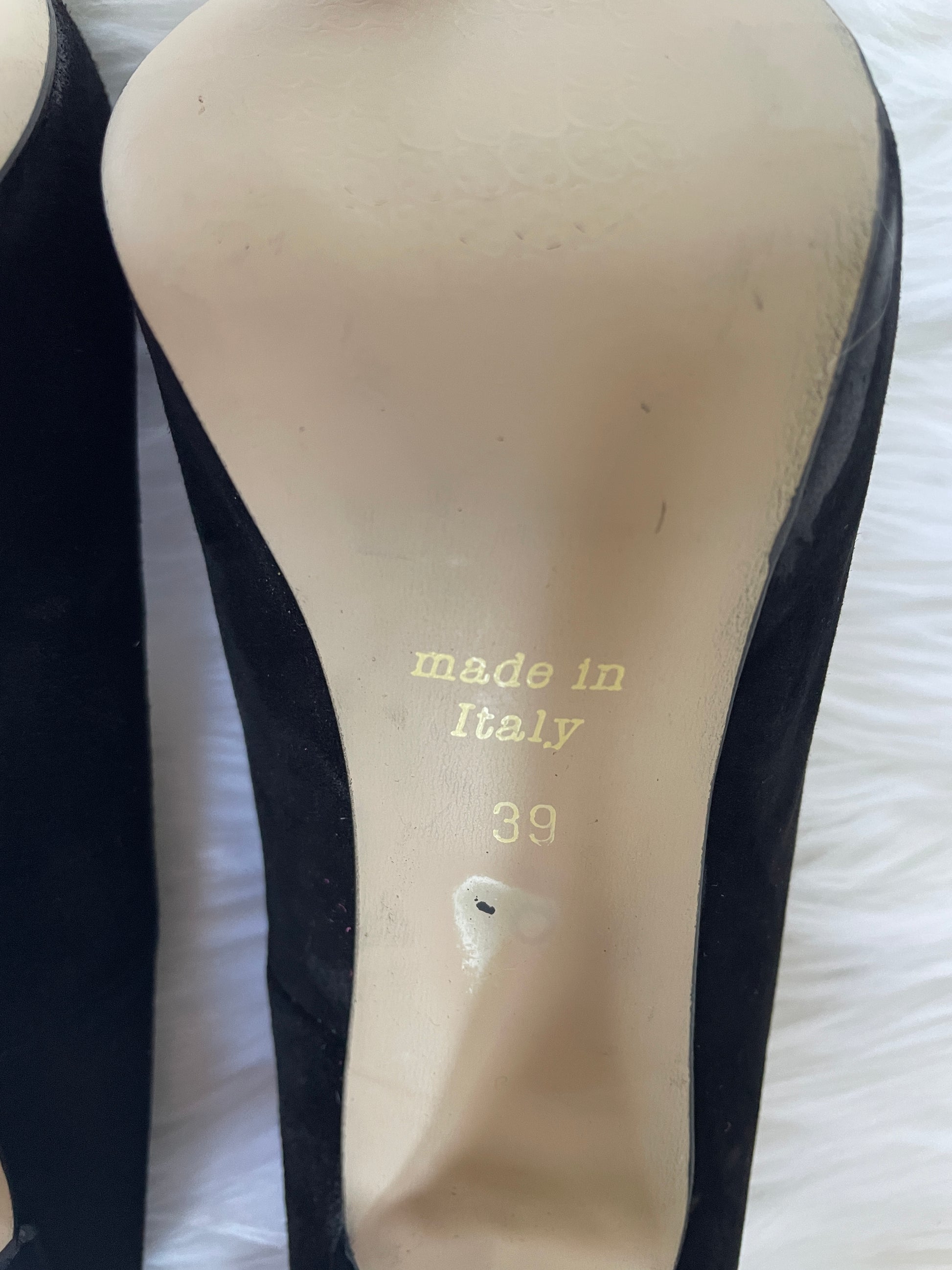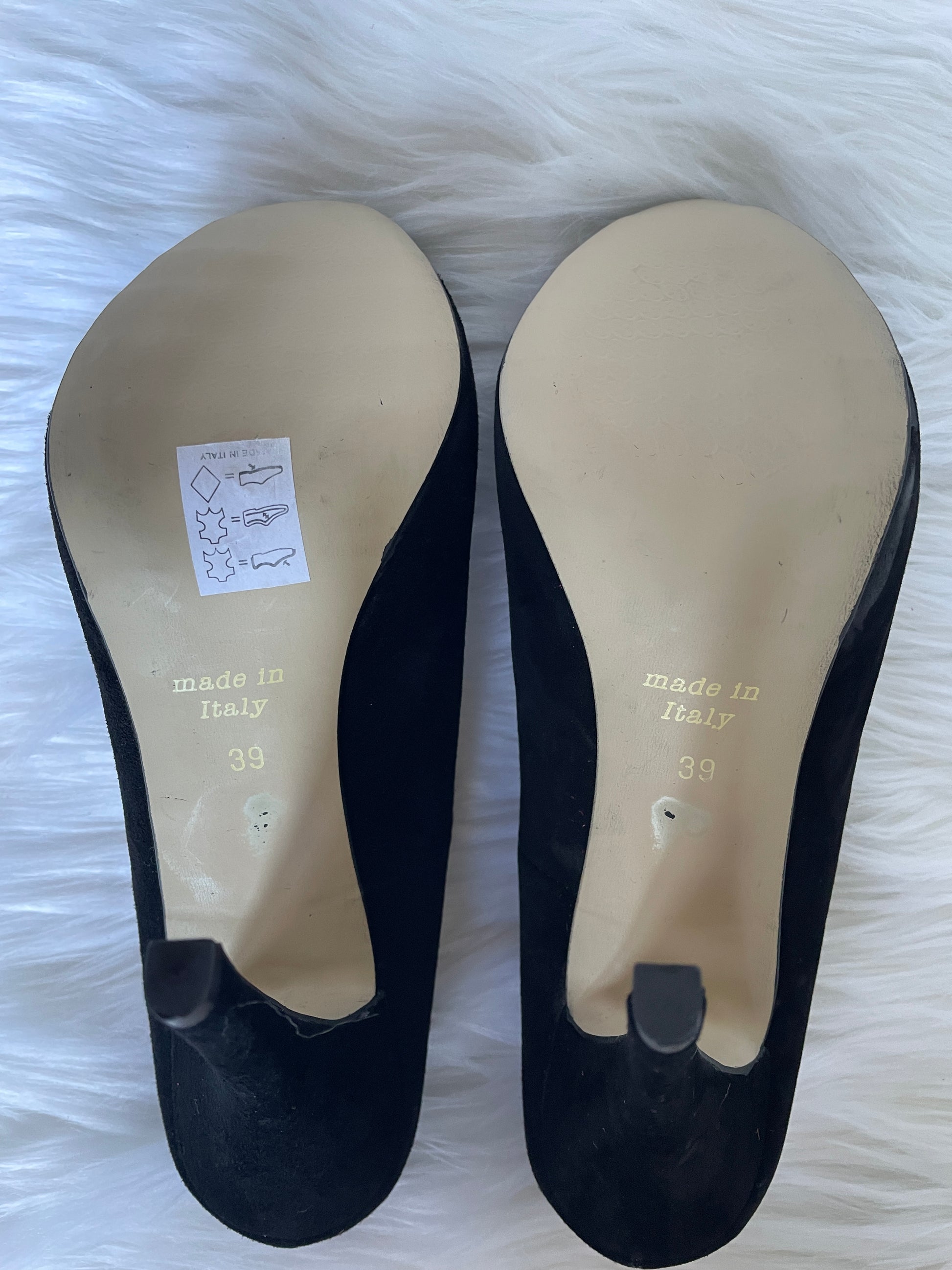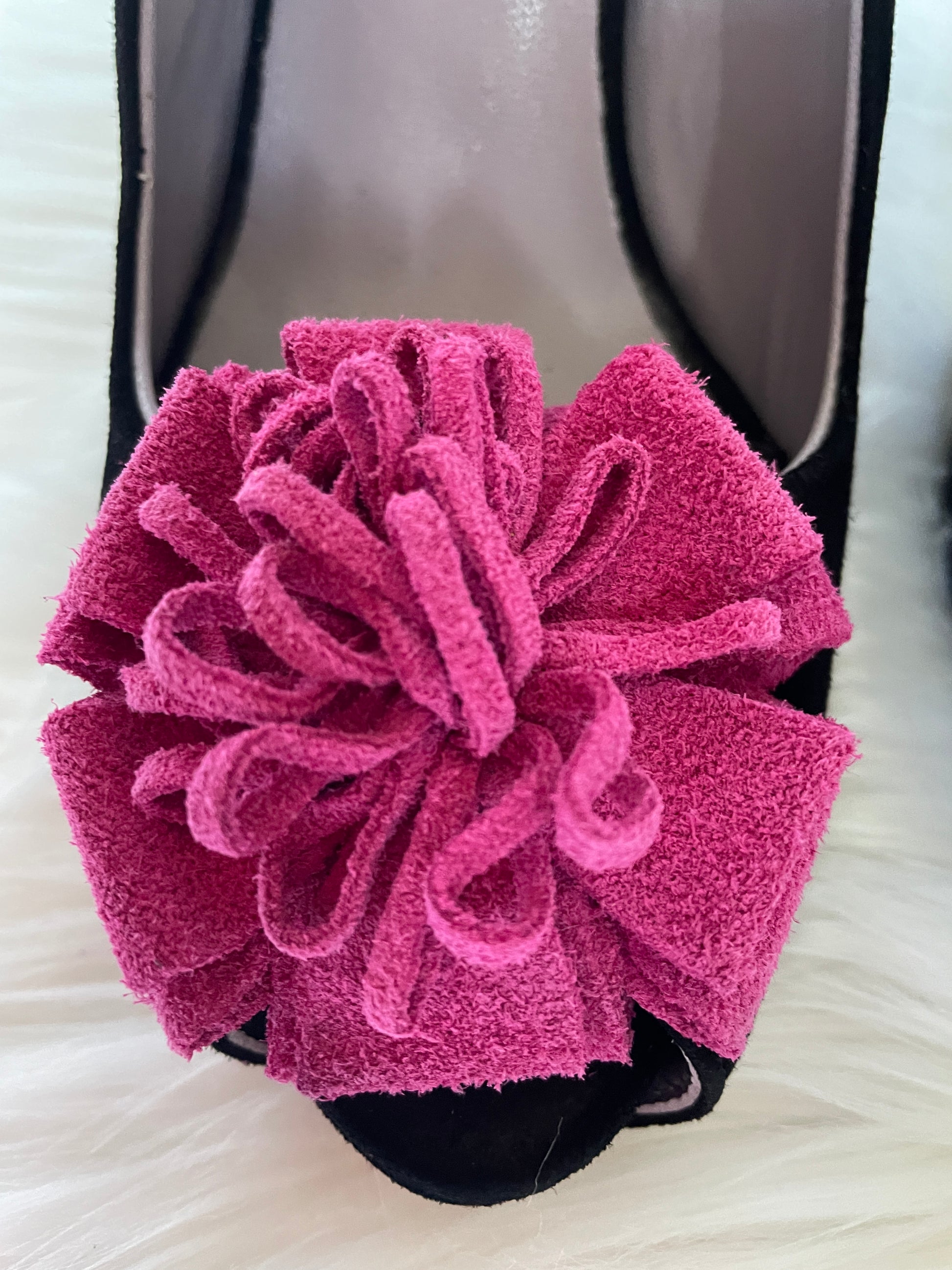 LUCIANO MIGLIORE Black Suede Stiletto Heels with Pink Flower, Size 39 EU