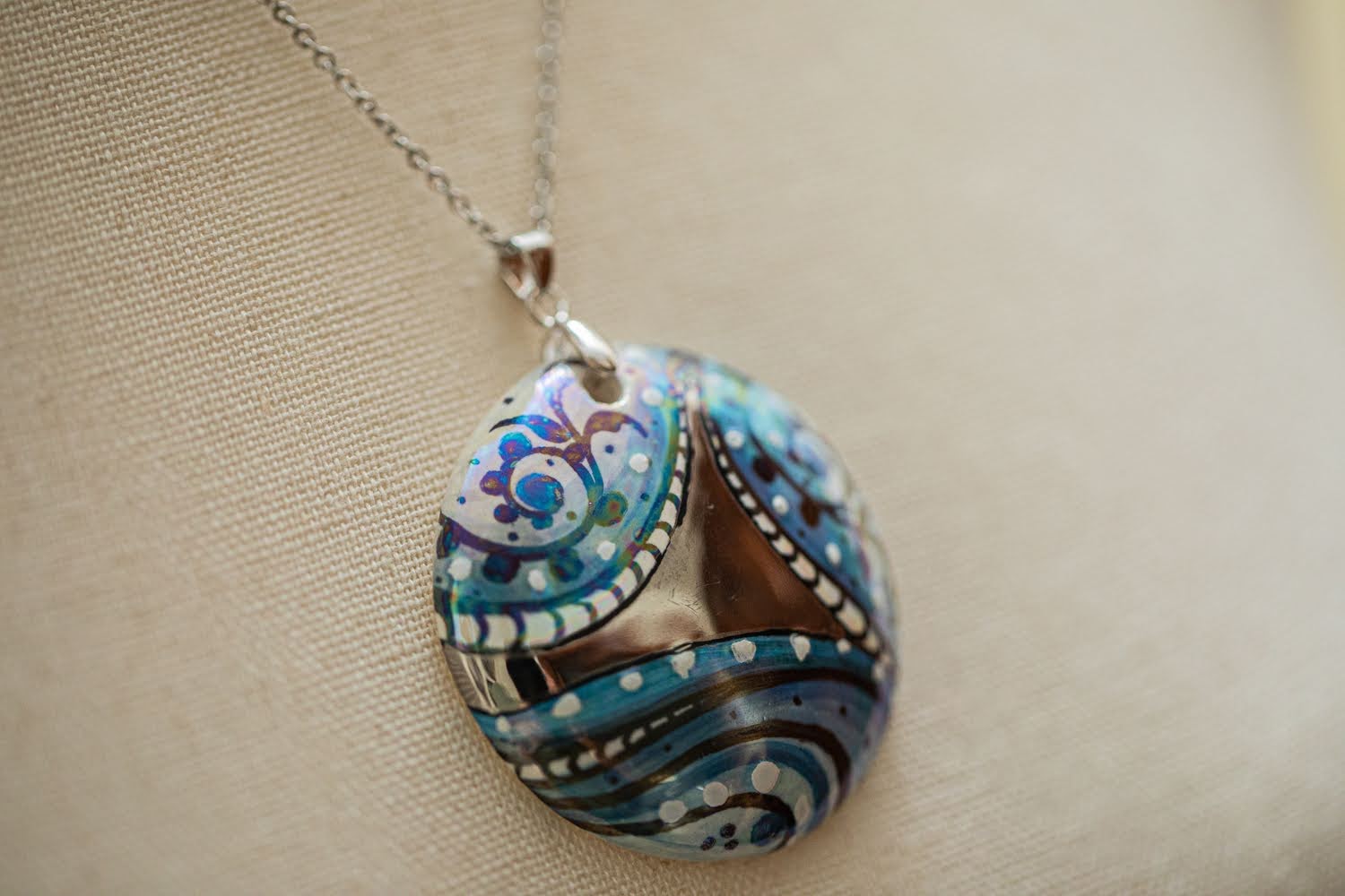 The Silver with Blue Swirl Large Round Necklace has platinum and mother of pearl lustra with a sterling silver (925) insert.