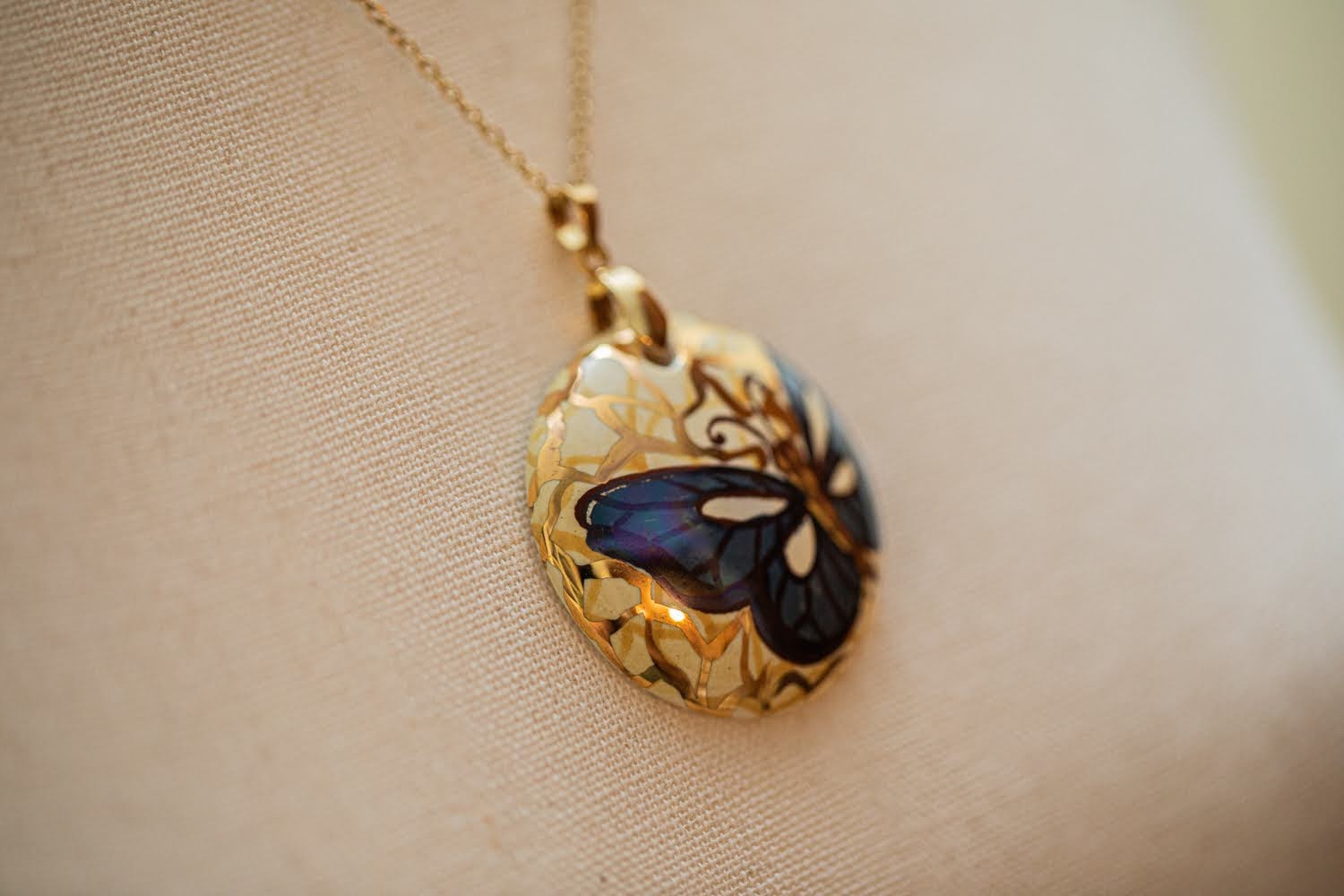 The Gold and Blue Butterfly Necklace from the Linea LUXURY collection is made with a pure gold insert and mother of pearl lustra.