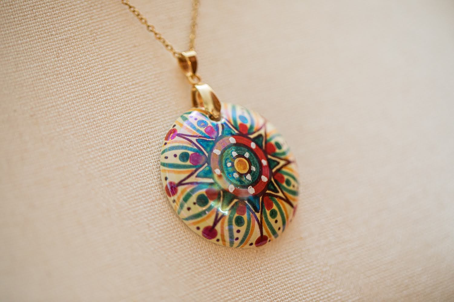 The Red and Green with Gold Starburst Small Round Necklace with a pure gold insert and mother of pearl lustra.
