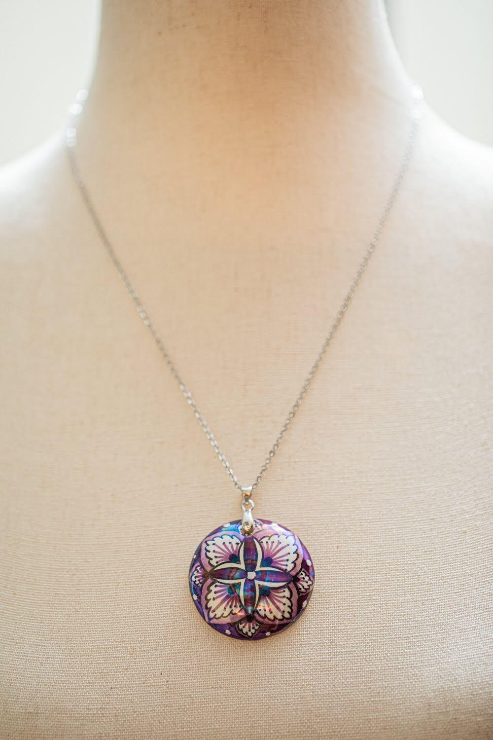 The Silver with Purple Flower Small Round Necklace has platinum and mother of pearl lustra with a sterling silver (925) insert.