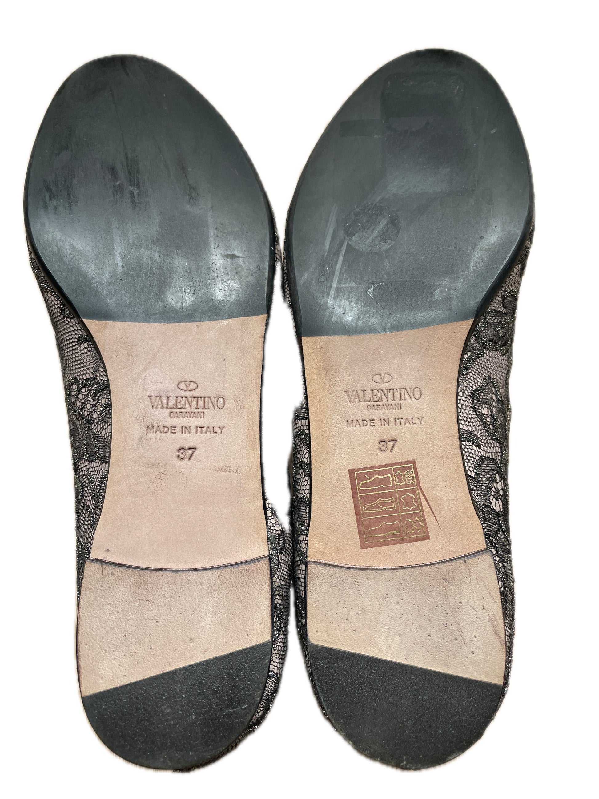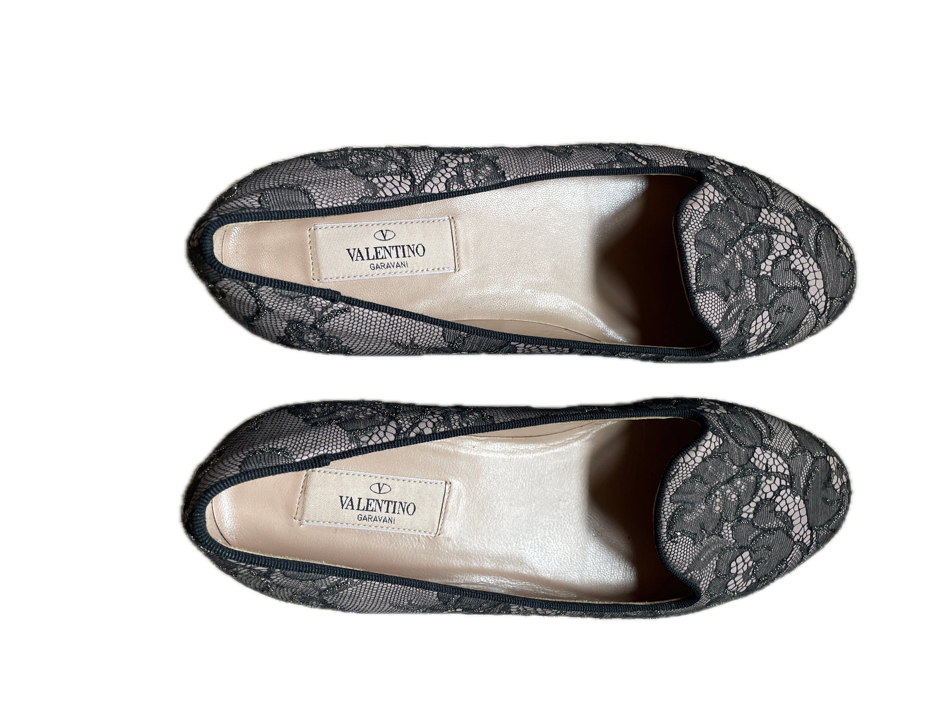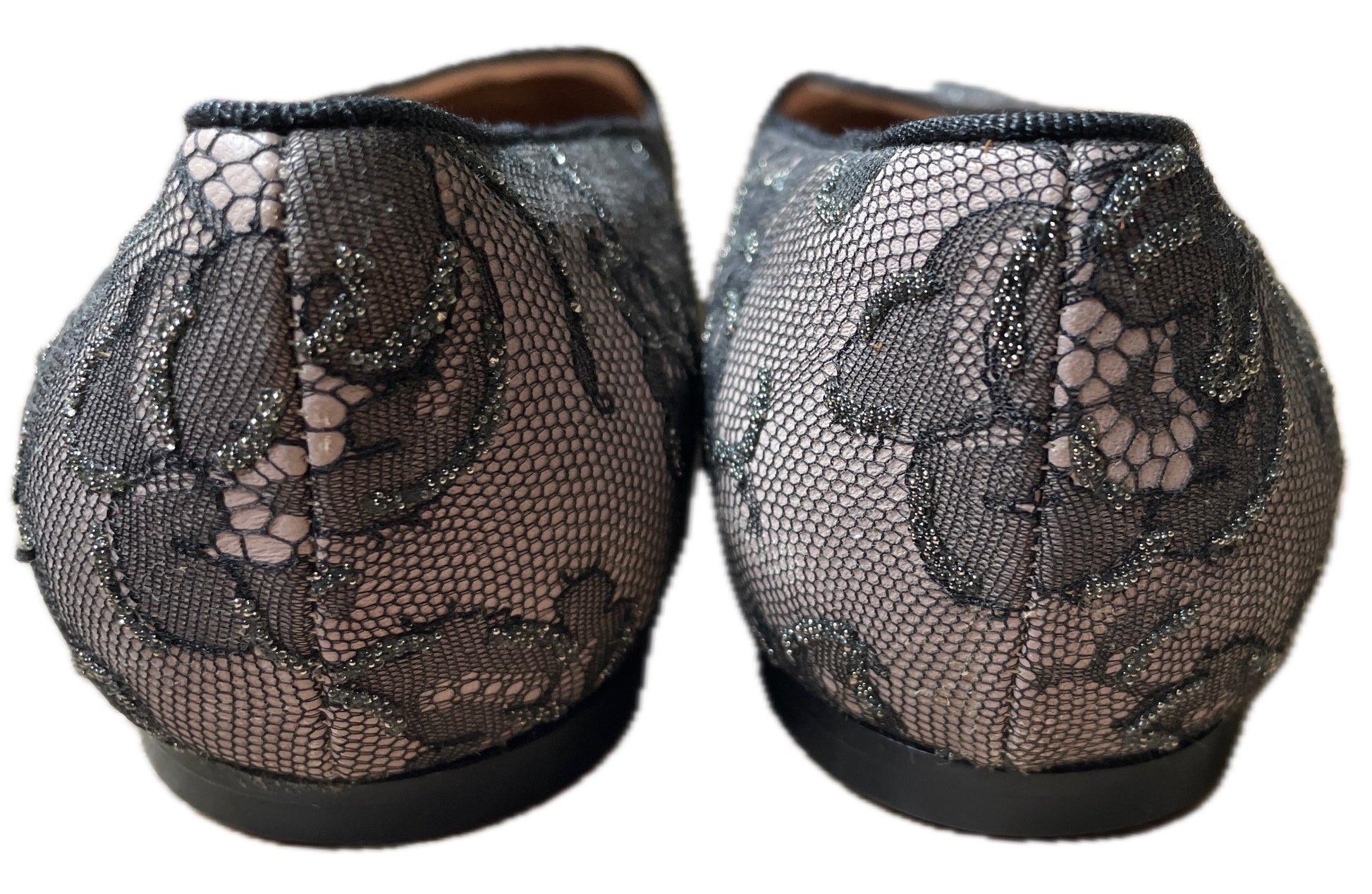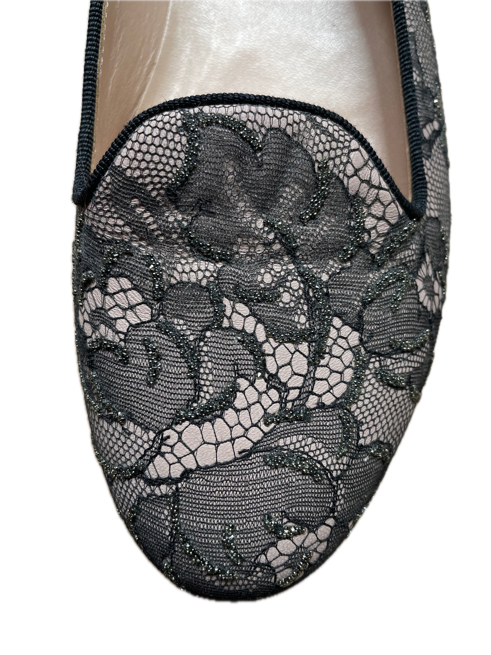 An exquisite and rare piece from Valentino’s 2013 archives, these Caviar Crystal Lace Smoking Slippers showcase the brand’s signature elegance and craftsmanship. Featuring a delicate black lace overlay on a blush-pink base, they’re accented with shimmering micro-crystals and finished with a refined grosgrain trim.